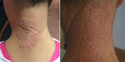 2、苔藓样皮损:神经性皮炎的皮损特征为皮肤苔藓化,病变区皮肤呈苔藓样变,皮肤增厚、皮纹加深、皮嵴隆起,皮损区呈暗褐色,干燥,有细碎脱屑,边界清楚,边缘可有小的分散的扁平丘疹。
